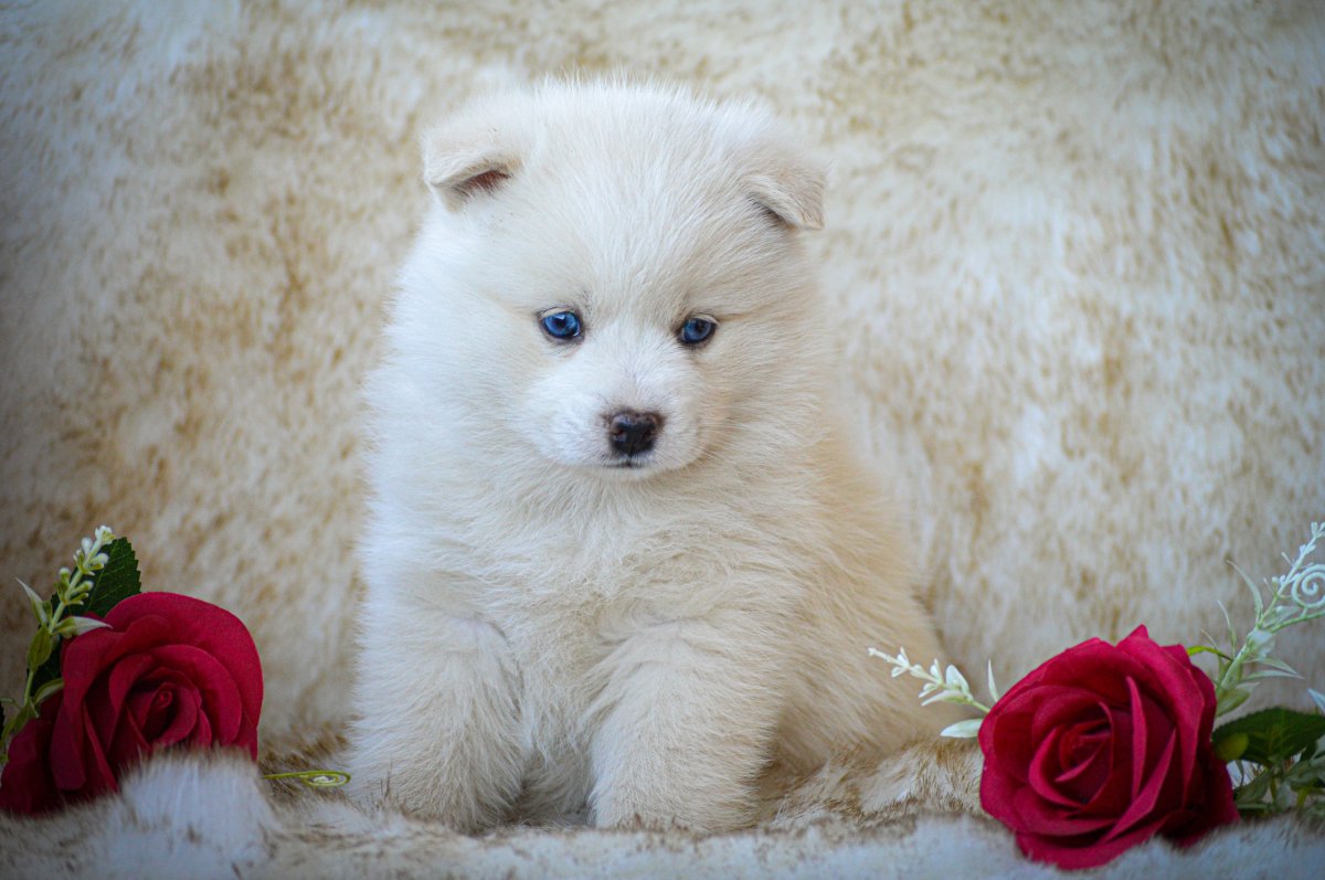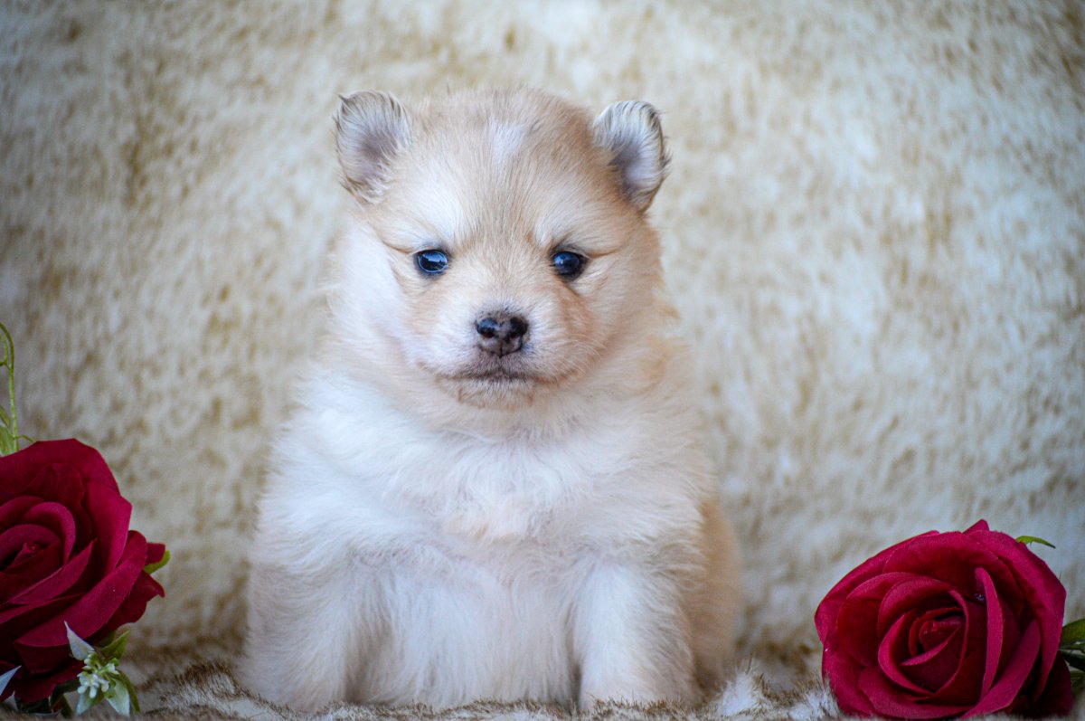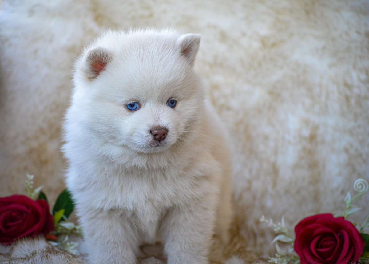 Petit femelle de couleur crème, poil polaire mi-long, yeux bleus
