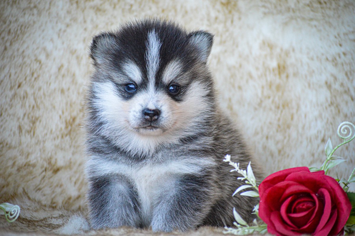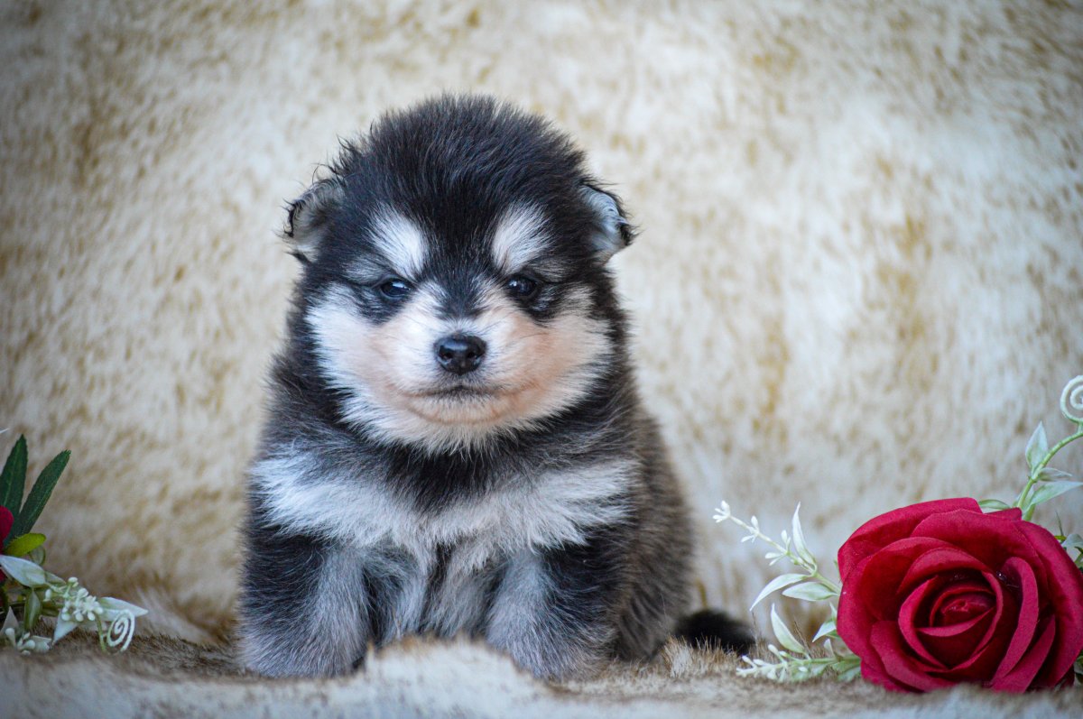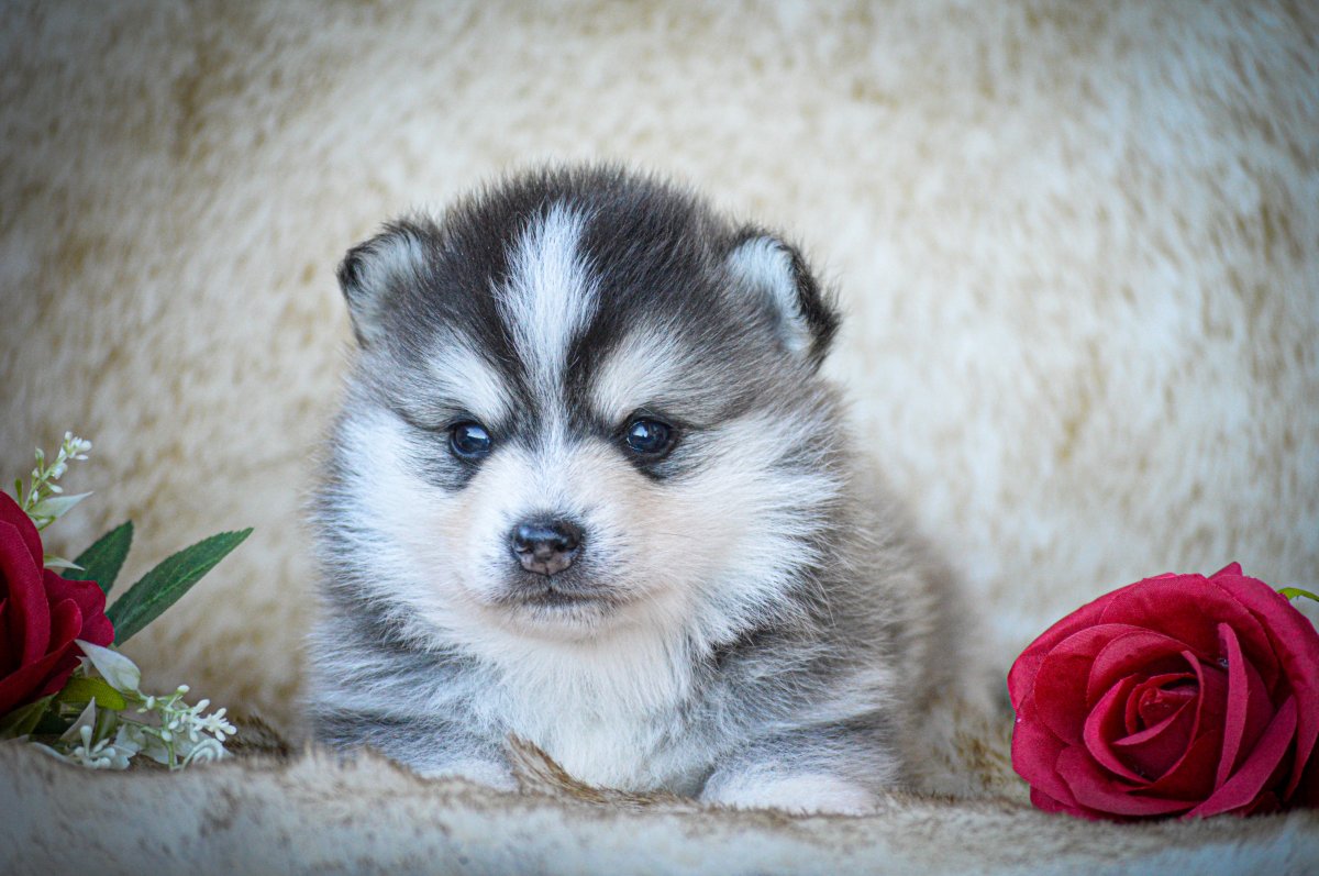 Petit mâle de couleur gris/noir avec un masque husky blanc, poil polaire mi-long, yeux marrons