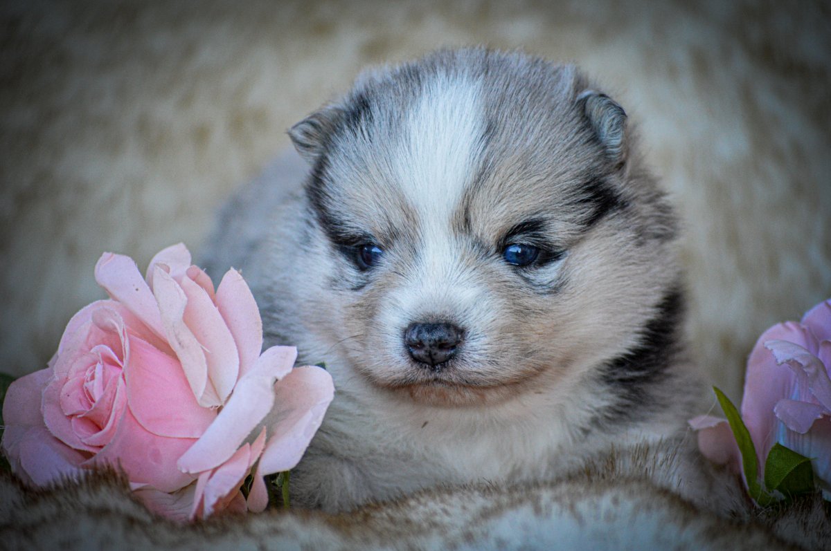 Petite femelle noire, blanche et grise. Masque husky, poitrine et chaussettes blanches. Poil polaire. Jumelle de Kiwi, yeux jaunes