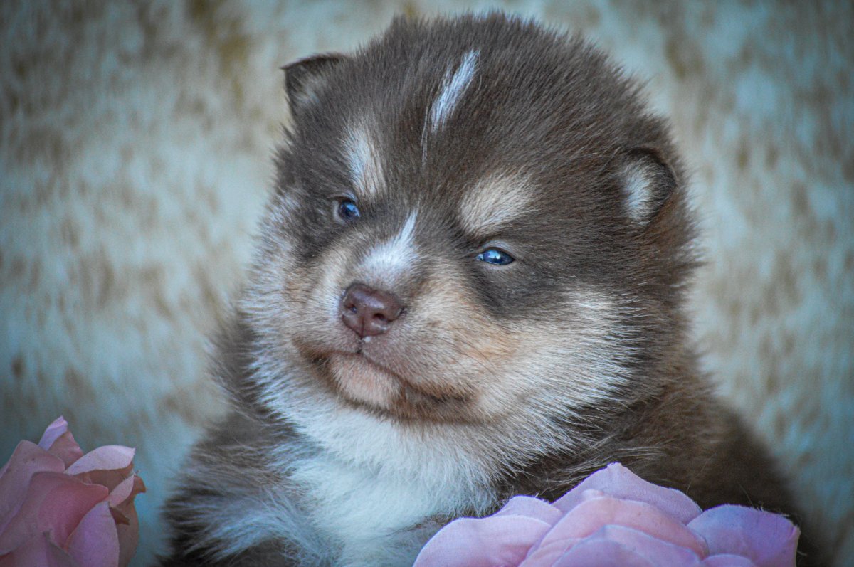 Petit mâle de couleur chocolat /feu, poil polaire (loup), yeux bleus